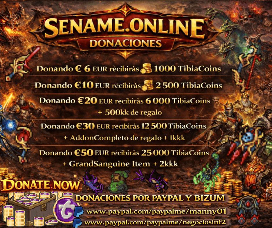 Les comparto la información sobre las donaciones y todo lo que necesitan saber, por ahora es mediante PayPal. Sus puntos irán directo a su cuenta y los pueden comprar en ShopOffer en esta misma pagina o mandar un mensaje al Community Manager o lmiguelm26 dentro de Discord para que les envien sus TibiaCoins. Pueden unirse al discord con el siguiente link: https://discord.gg/XMQRVz5gzx